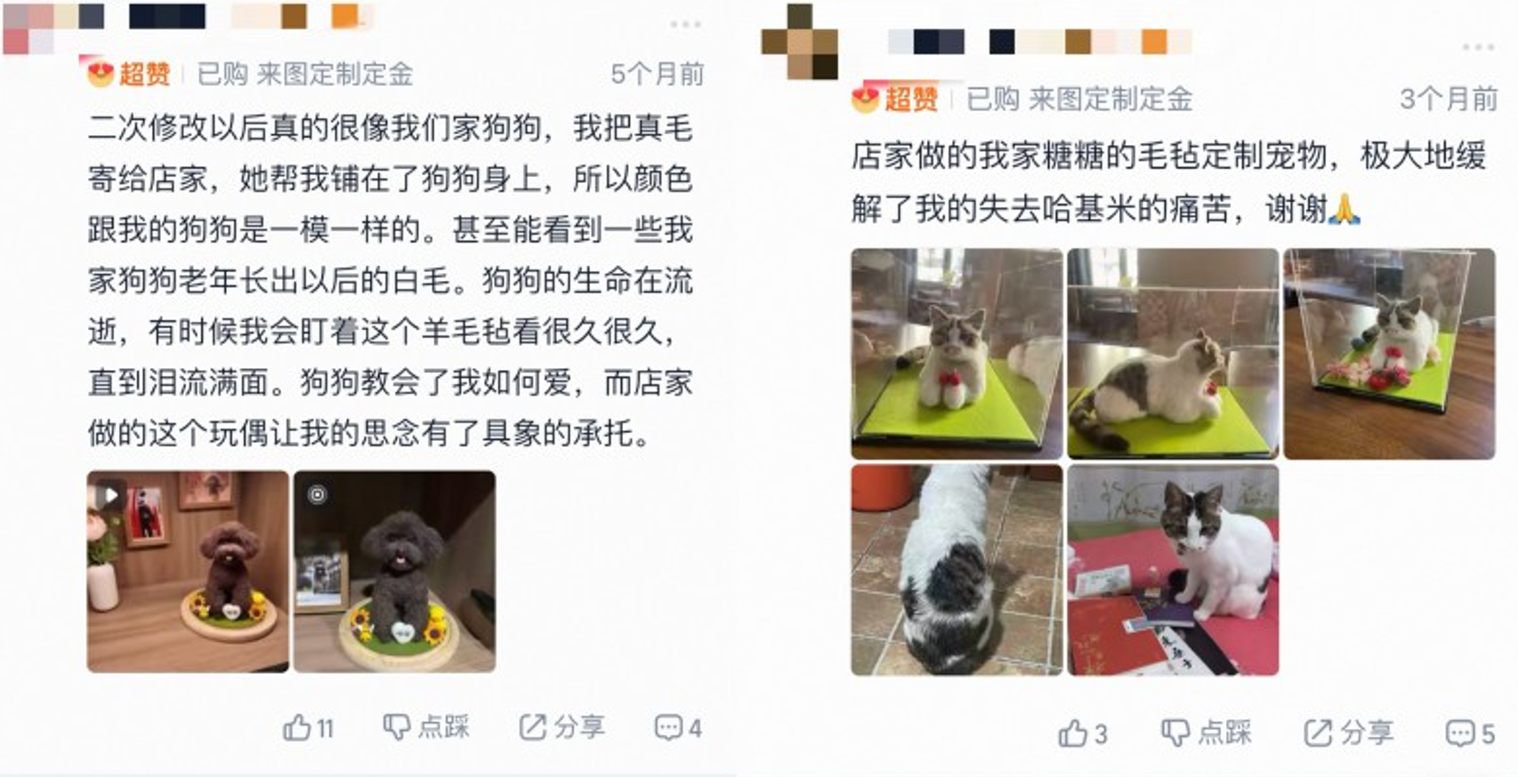 据介绍,平台上不仅有前沿的数字技术延续爱意,还有许多充满温度的手作店铺,用一针一线帮铲屎官留住温情。十三年前,琴姐在淘宝开了一家名为“御姐屋毛毡手艺”的店铺,一针一针地戳出宠物仿真羊毛毡,把爱宠的模样永久定格。