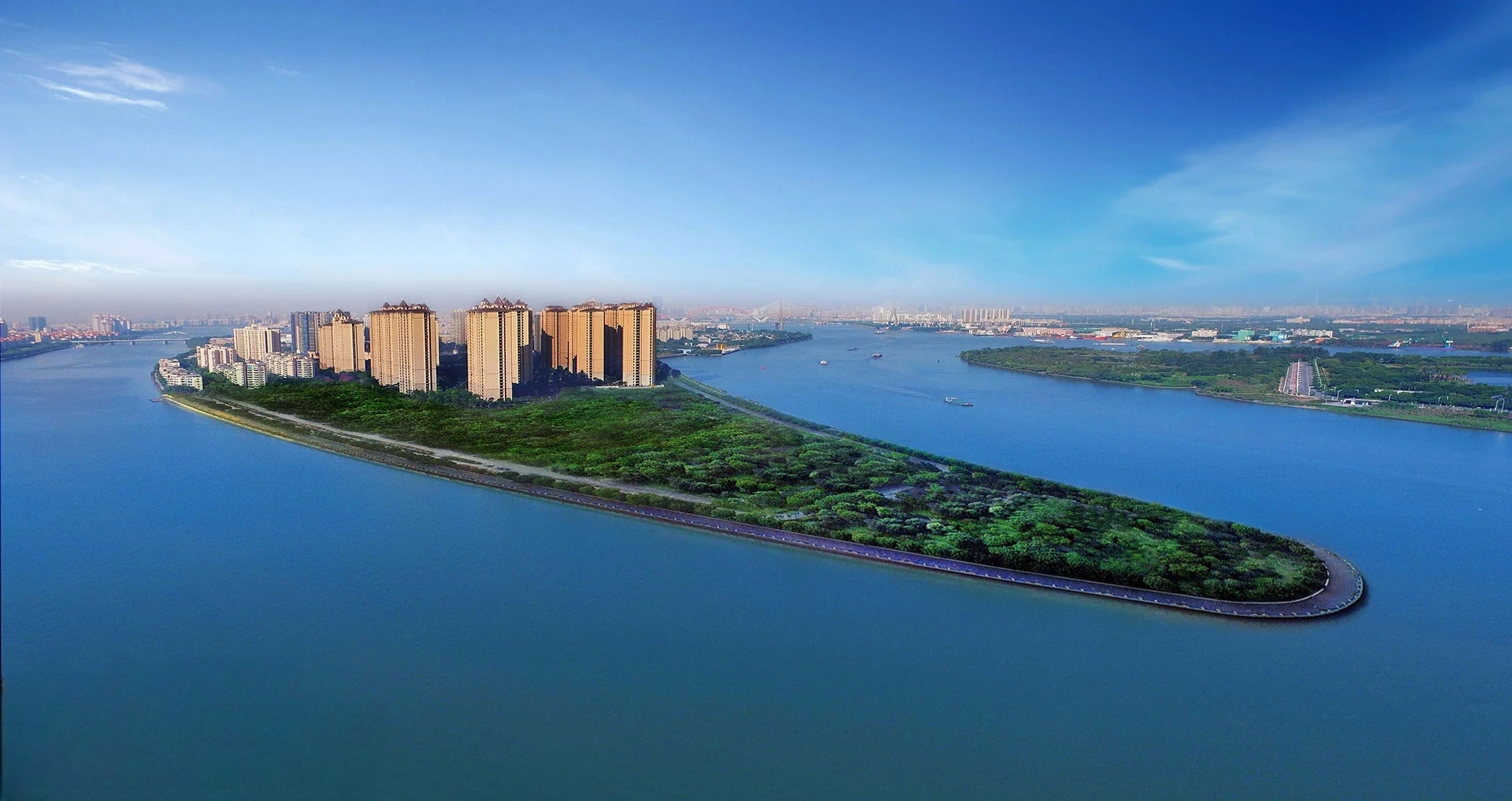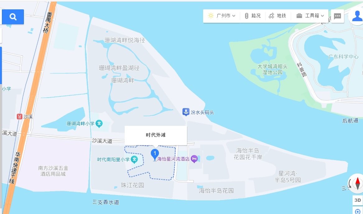 笔者有位朋友就住在珊瑚湾畔的临江别墅区,站在楼顶可同时将大学城、海珠湿地和小洲艺术村尽收眼底;道路南边的鱼脖位置,即时代外滩和珠江花园。在地形上,珠江花园和海怡半岛花园是夹着时代外滩的,霸占了南边所有一线江景位置。