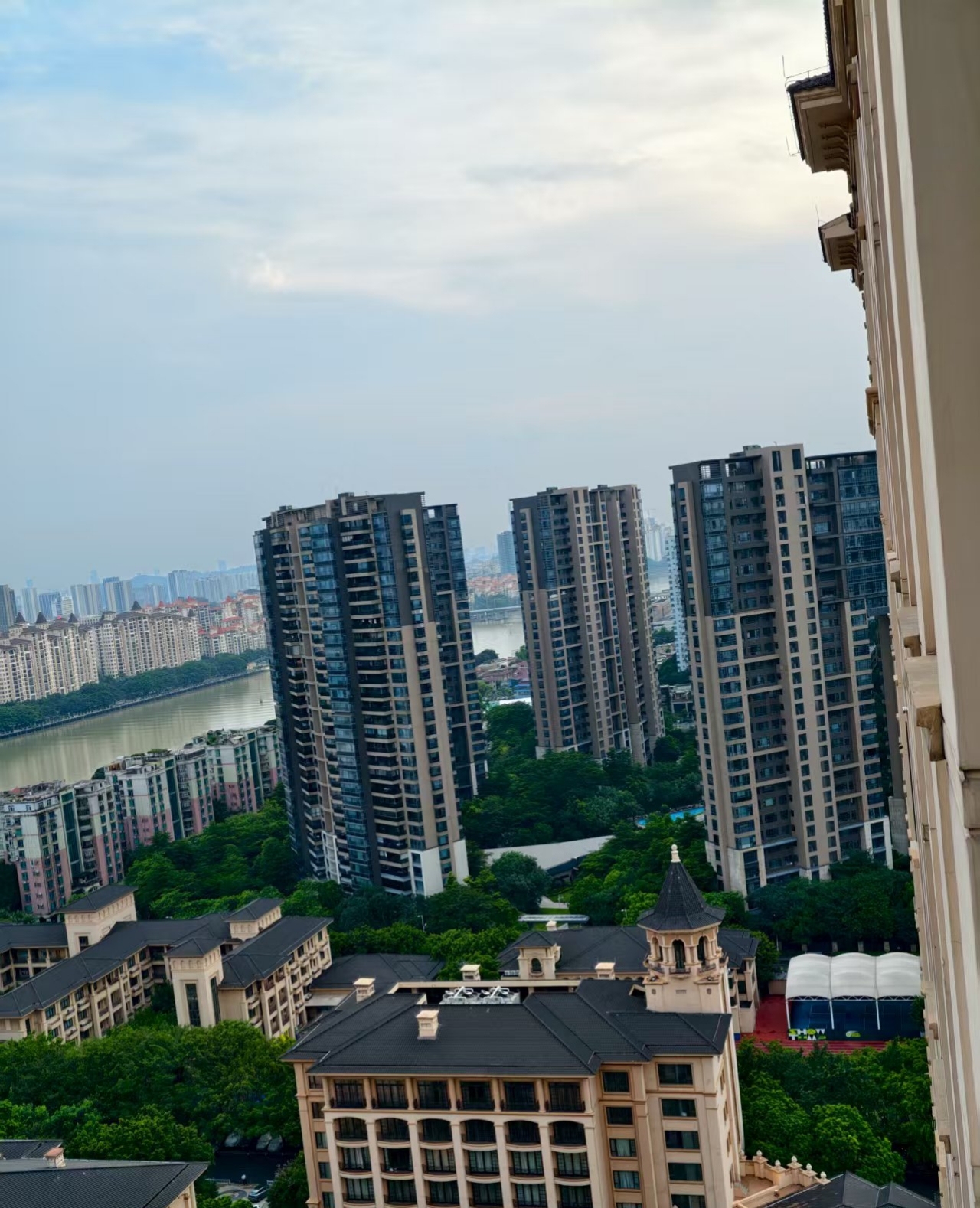 从海怡半岛出来是一路向西的沙溪大道,独揽一线江景的北边鱼眼位置,也是和记黄埔的地盘,开发成了珊瑚湾畔别墅群,临街部分的高层洋楼别名珊瑚天峰。